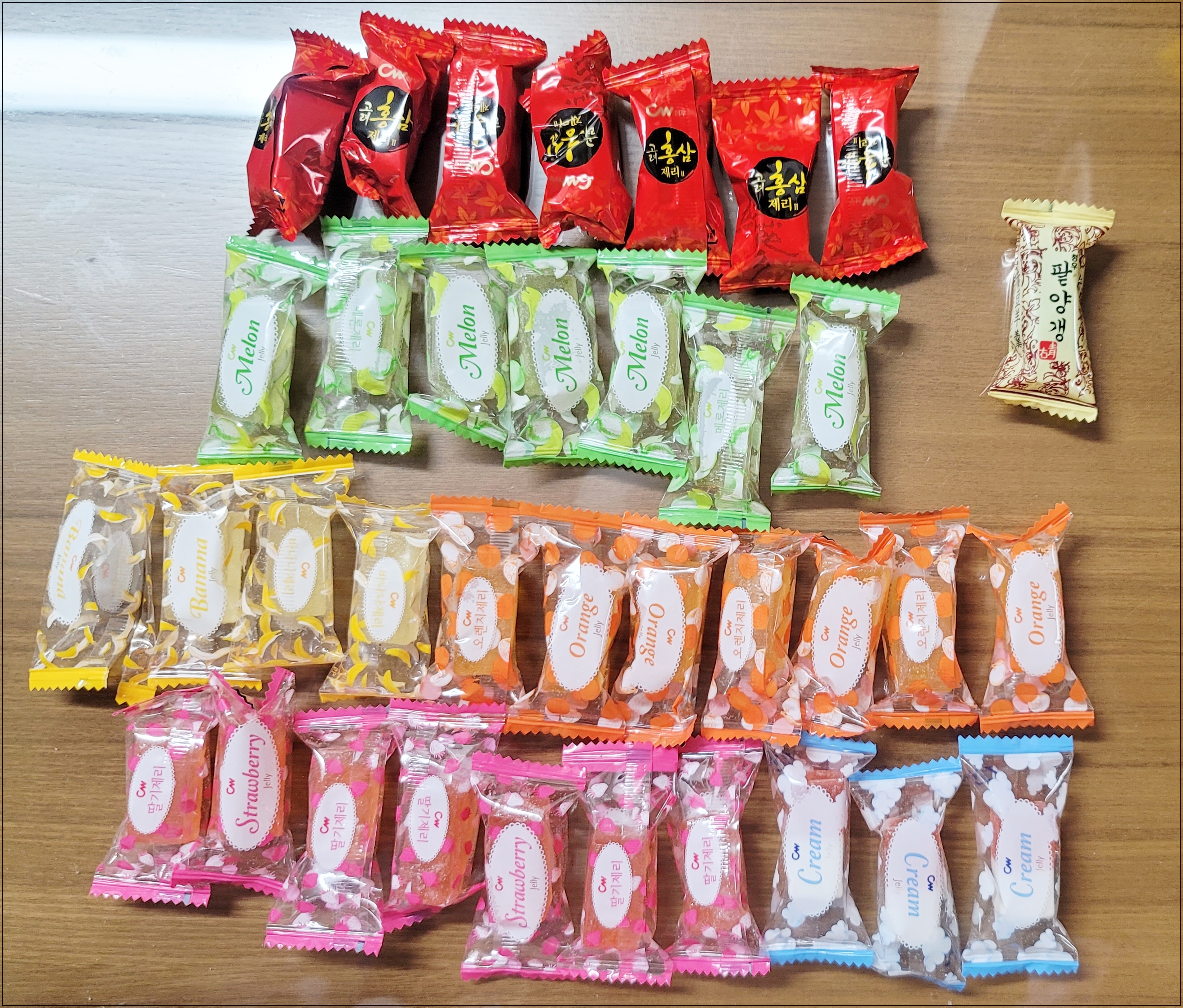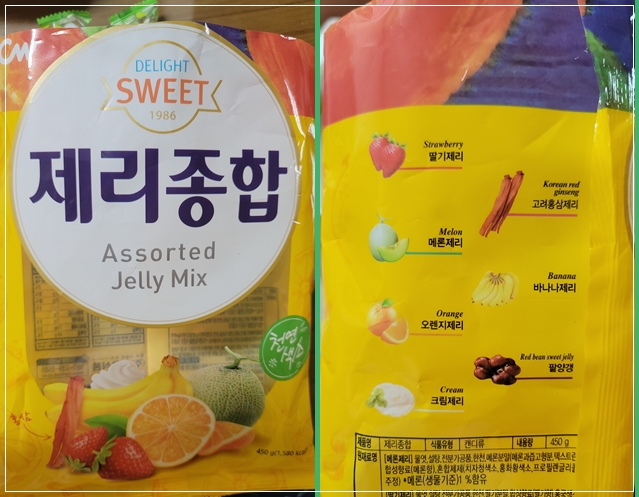 팥양갱 1개 무엇??? ㅋㅋㅋㅋ 맛별비율이 랜덤인 것인지 모르겠으나 제가 산 제리 한봉지 에는 비율이 이렇게 되어있었어요.. 이 중에서 저는 오렌지가 제일 맛있더라구요!! 홍삼... ㅠ_ㅠ 하아.... 굳이 홍삼맛을 제리에 첨가했어야 했는지.. 흑.. 그래도 저는 선호하지 않지만 홍삼맛을 즐기는 분들도 계실 것 같아요. 그래서 다양한 맛별 종류가 들어있다는 것은 골라먹는 재미가 있을 것 같습니다. 이름이 왜 종합제리 인지 알수있는 부분인 것 같네요 ㅎ