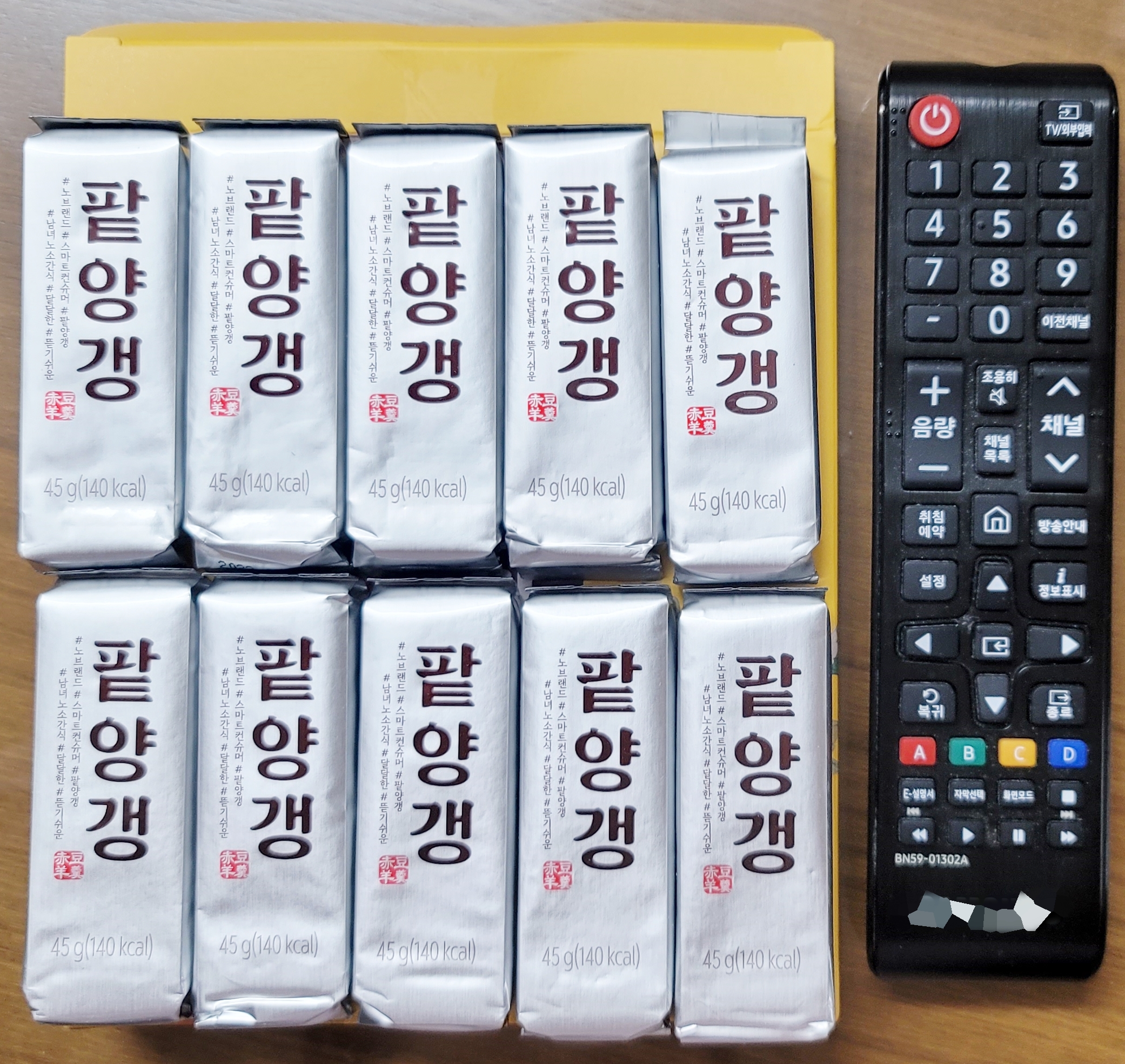 한상자에 총 10개의 낱개포장으로 구성되어 있습니다. 크기는 TV 리모컨과 비교를 해 보았습니다. 제 기준으로는 간단하게 한두개씩 먹기에 부담없는 크기로 너무 적당하다고 생각되었습니다. 양갱을 좋아하시는 주변분들께 선물하거나 같이 나눠먹기에도 좋을 것 같아요~~~ 주관적인 평가이지만 제 입맛에는 많이 달지않고 (양갱 특성상 아예 안달지는 않습니다.) 적당한, 아메리카노와 함께 먹기에 좋은 간식이었습니다.
