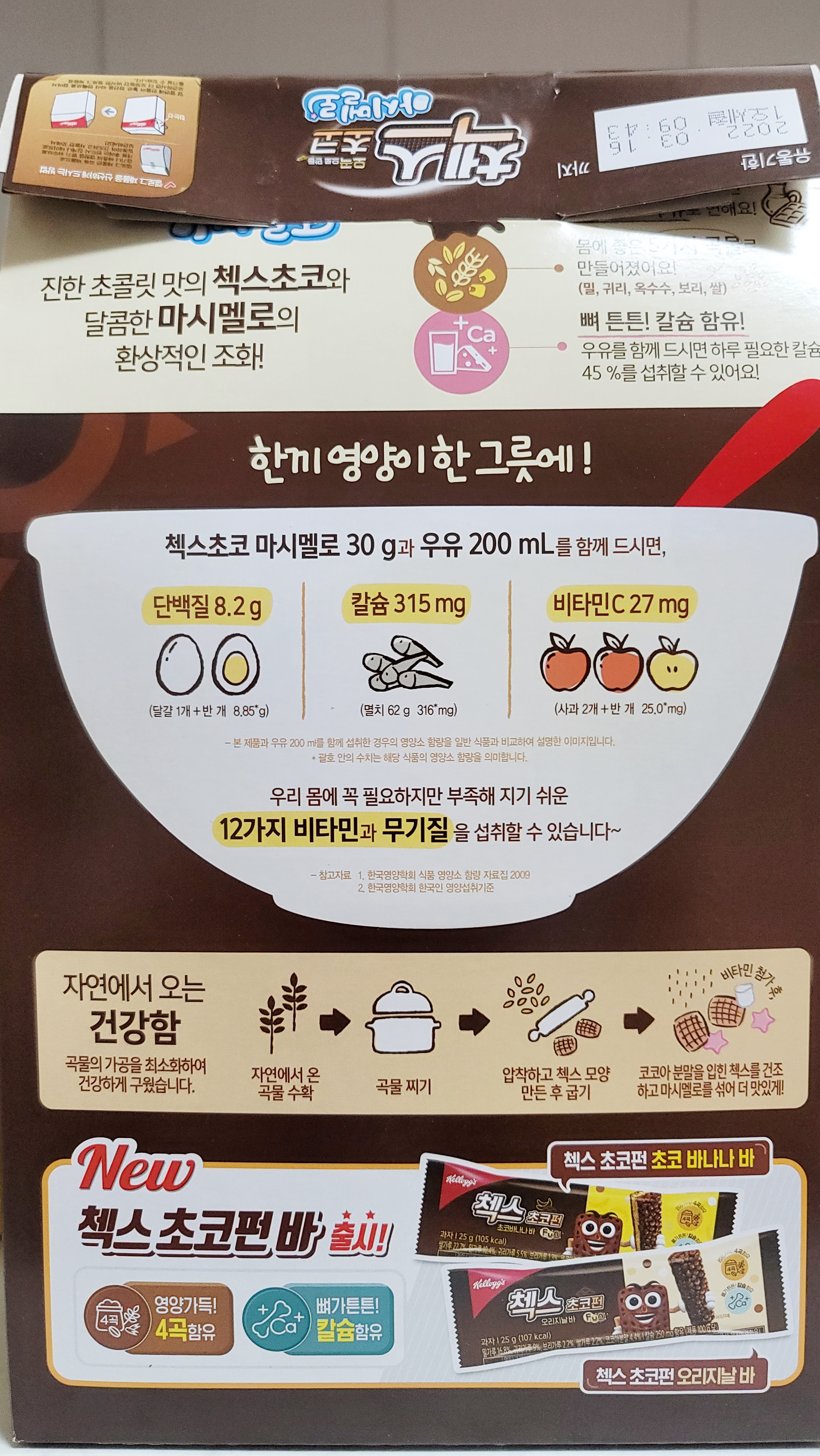 파맛 첵스 파동(?)이 일어난 이후 늘 즐겨먹던 초코 첵스를 뿌리치고 파맛을 선택한지 어언 반년이 지났습니다. 점점 그리워 지는 초코 맛 첵스를 다시 구입 해 보았습니다. 마시멜로가 첨가된 첵스가 있었네요.. 마시멜로에 혹해서 바로 사본 이 아이... 영양성분은 어떤지 보겠습니다.