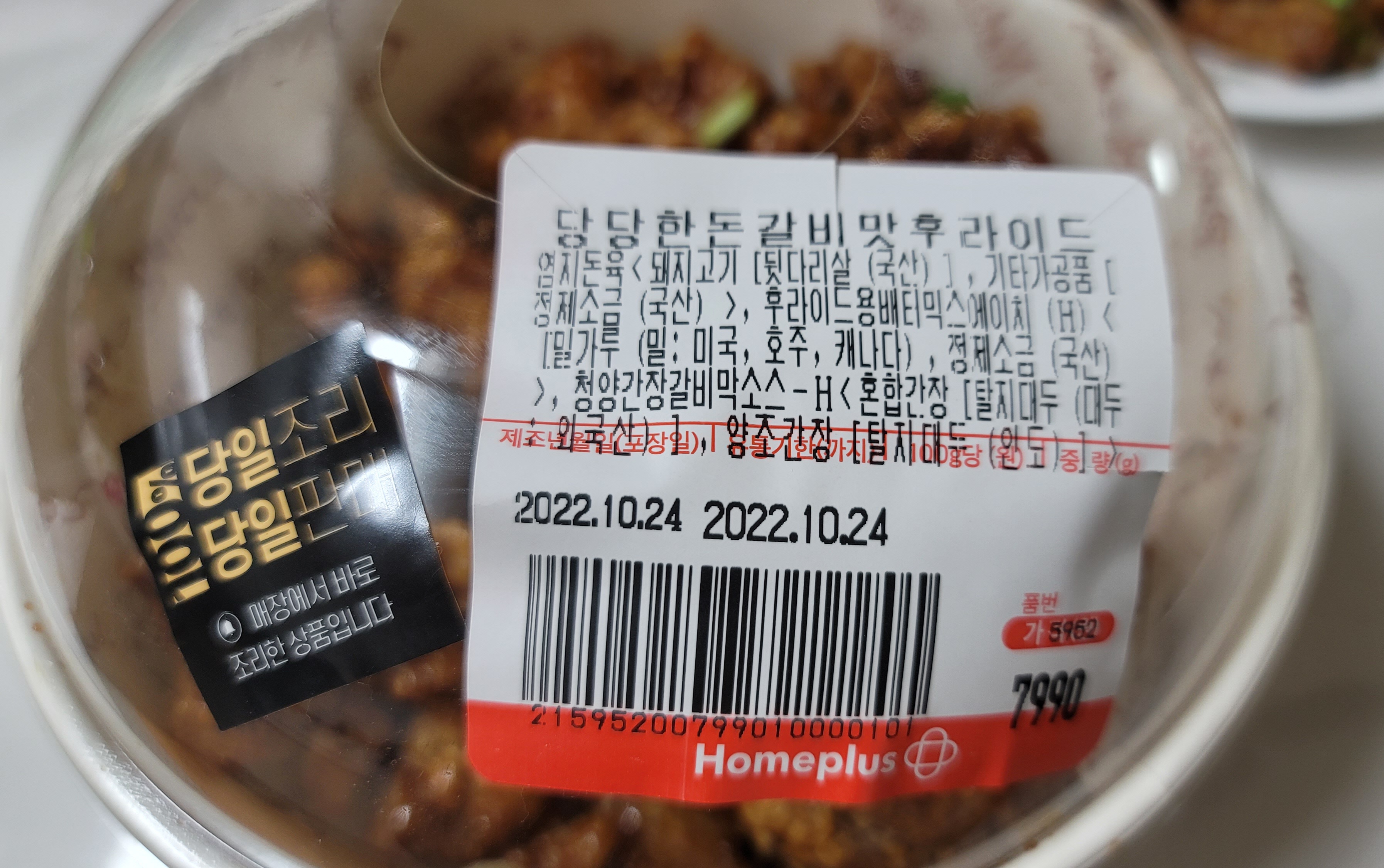 전자레인지에서 1분을 데워져 나온 갈비맛 후라이드 인데요, 돼지고기라 그런지 아무리 닭강정 양념이라도 차갑게 먹기보다는 조금 따뜻하게 데워진것이 좀 더 나은맛을 선사하는듯 합니다. 간식으로도 괜찮을것 같지만 술 안주로도 대박 일것 같습니다. 양념 안된 후라이드도 있었는데 치킨 후라이드 맛 일런지, 다음에 가면 꼭 사와봐야 되겠습니다. 개인적으로, 한국산 이므로 재료가 좋다고 생각하기에 너무 괜찮은 메뉴라고 생각합니다. 물가 고공행진 상황속에서도 물가부담 없이 맛있는 메뉴를 선택할 수 있도록 노력하겠다는 홈플러스.... 정말 호감이네요ㅋㅋ 홈플러스 화이팅 입니다. 소풍갈때 잔뜩 사가고 싶은 맛 이에요. 홈플러스 당당시리즈 기대할게요 :)