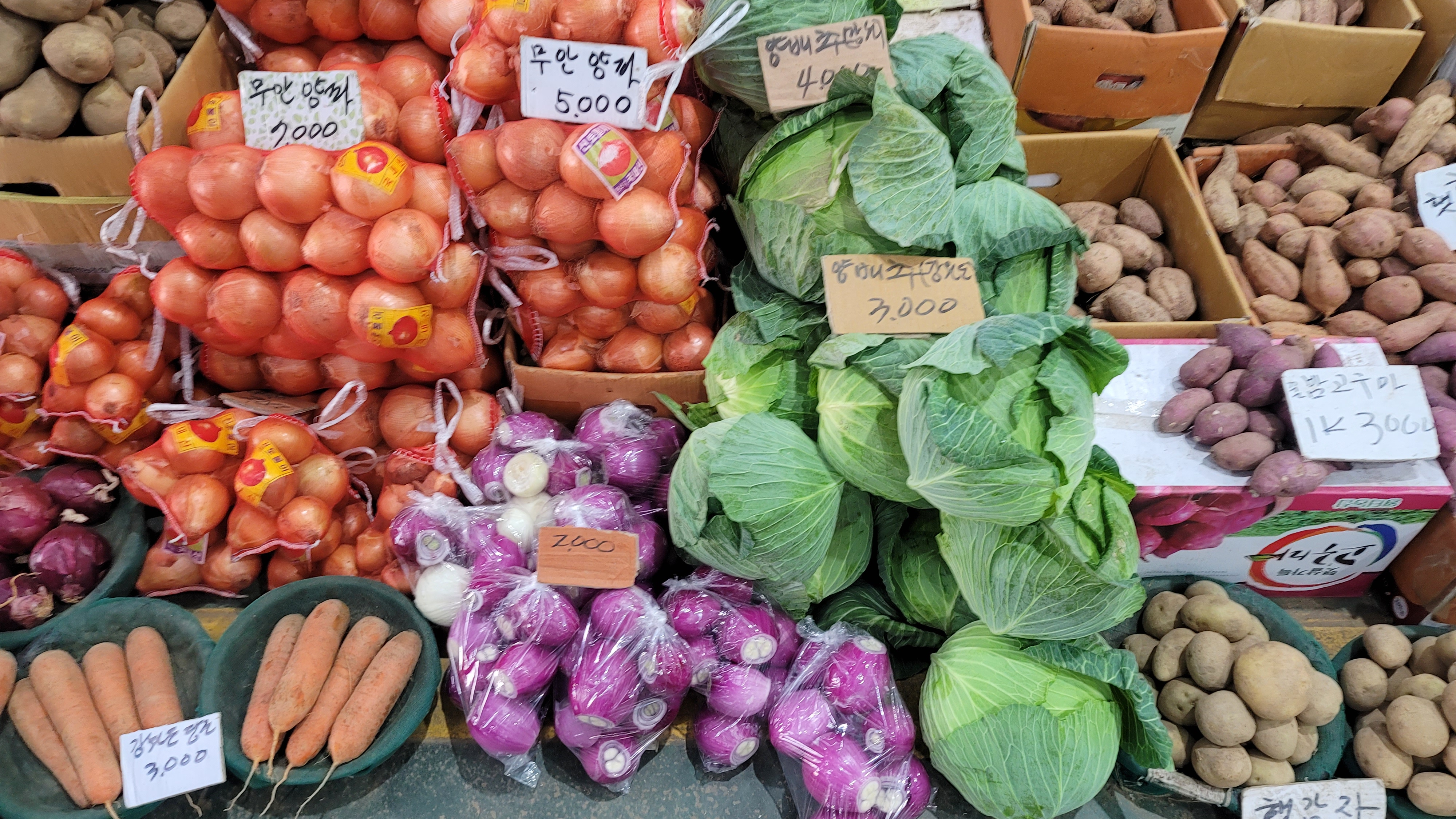 양파, 양배추, 당근이 나와있네요. 양파 한망에 5천원 이에요. 대형마트보다는 시장채소가 역시 조금 저렴하군요