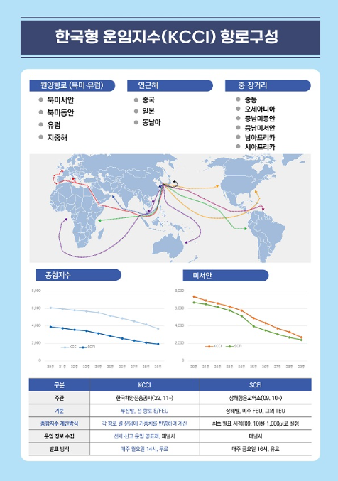 상해에서 출발하는 운임을 지수화한 상하이컨테이너운임지수(SCFI)도 대체해 한국 실제 상황에 맞는 정확한 운임 정보를 제공하기 위해 ‘한국형 컨테이너 운임지수(KCCI)’를 개발하고 이달부터 매주 공표한다.
