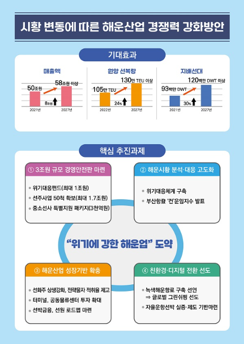 이를 위해 고위험 선사 구조조정, 인수합병(M&A) 등을 지원하는 한편, 환경규제 등 각종 외부환경에 신속히 대응하기 위해 5000억 원 규모, 선사 수요에 따라 최대 1조 원 규모의 위기대응펀드를 조성한다.