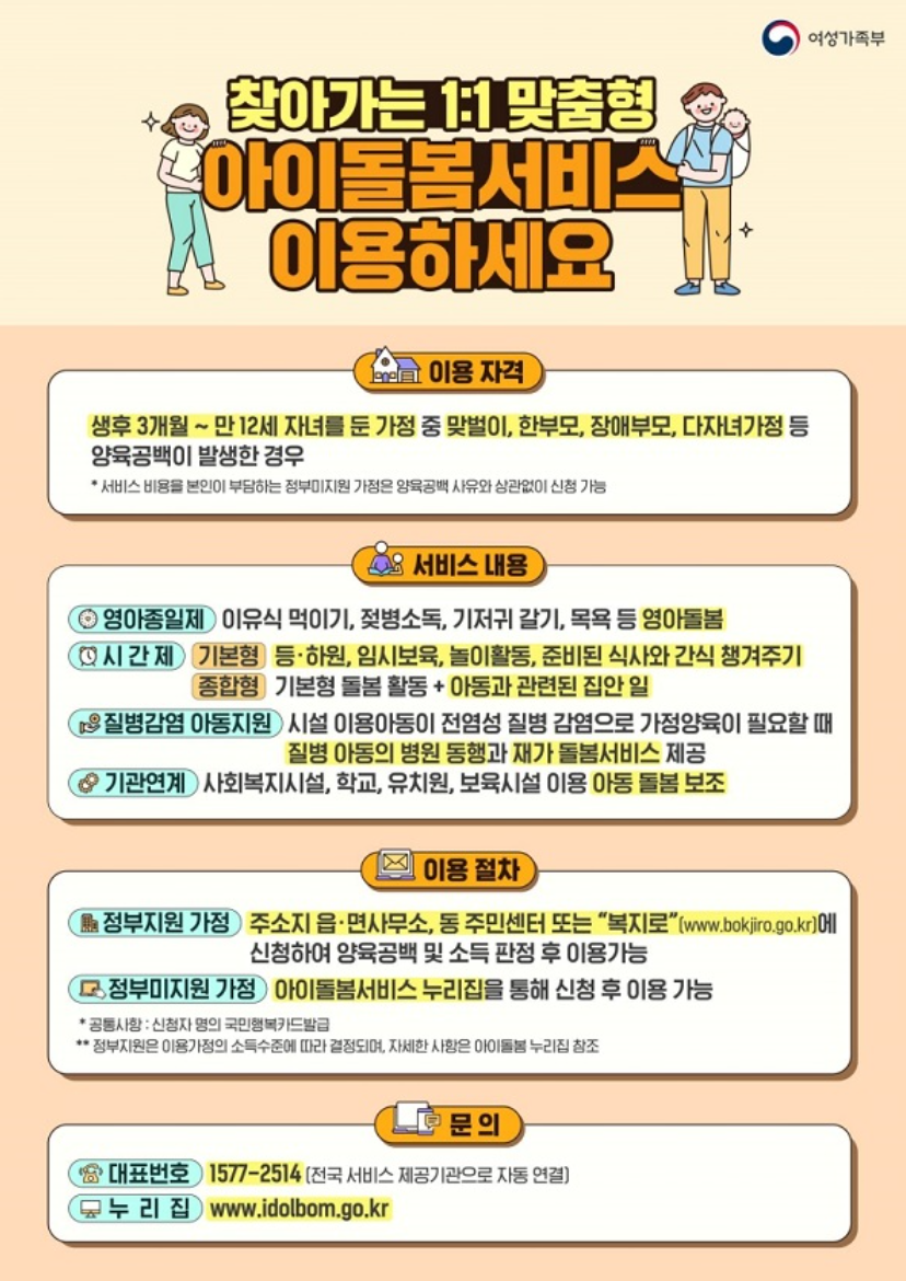 부모의 맞벌이 등으로 양육 공백이 발생한 가정에 ‘아이돌보미’가 찾아가 만 12세 이하의 아동에게 다양한 돌봄 서비스를 제공하는 아이돌봄 지원사업이다. 특히 내년부터는 인공지능 자동연결 시스템을 포함한 아이돌봄 통합 연결공간(플랫폼) 운영으로 다양한 돌봄 수요에 대응하고 더욱 최적화된 서비스 지원을 앞두고 있다.