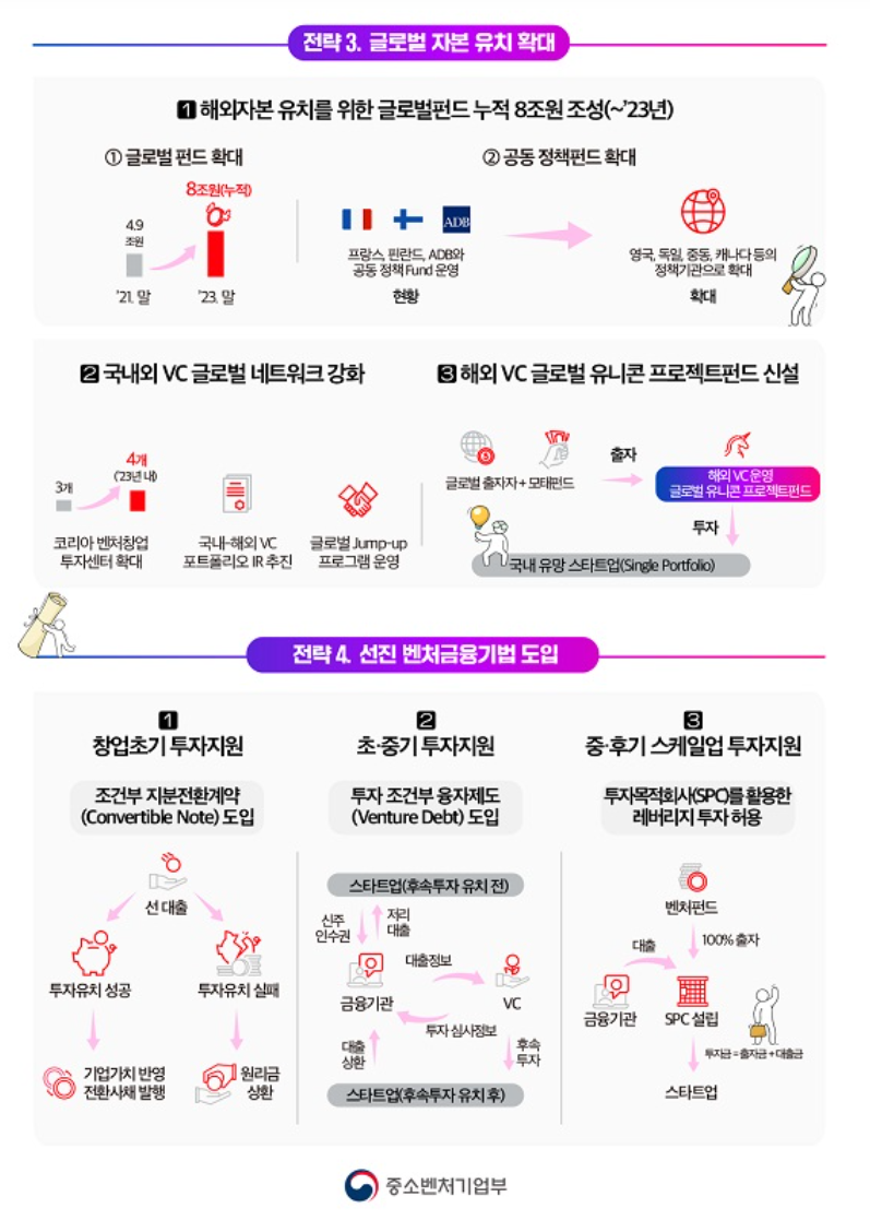 글로벌 자본 유치를 확대하기 위해서는 정부 모태펀드가 해외 벤처캐피탈과 함께 조성하고 있는 글로벌펀드를 내년 말까지 누적 8조 원 이상으로 확대한다. 미국 중심에서 중동, 유럽 등으로 조성 범위를 넓혀 국내 스타트업의 글로벌 진출 기회를 더욱 확장한다. 국내 벤처캐피탈 업계가 투자한 기업을 해외 투자사들에 소개하는 포트폴리오 IR을 추진해 국내·외 벤처캐피탈 간 글로벌 네트워크도 강화한다. 이를 위해 해외진출 희망 스타트업을 현지로 파견해 기존 해외진출 기업 및 해외 벤처캐피탈과의 네트워킹을 지원하는 ‘글로벌 Jump-up 프로그램’를 운영할 방침이다.