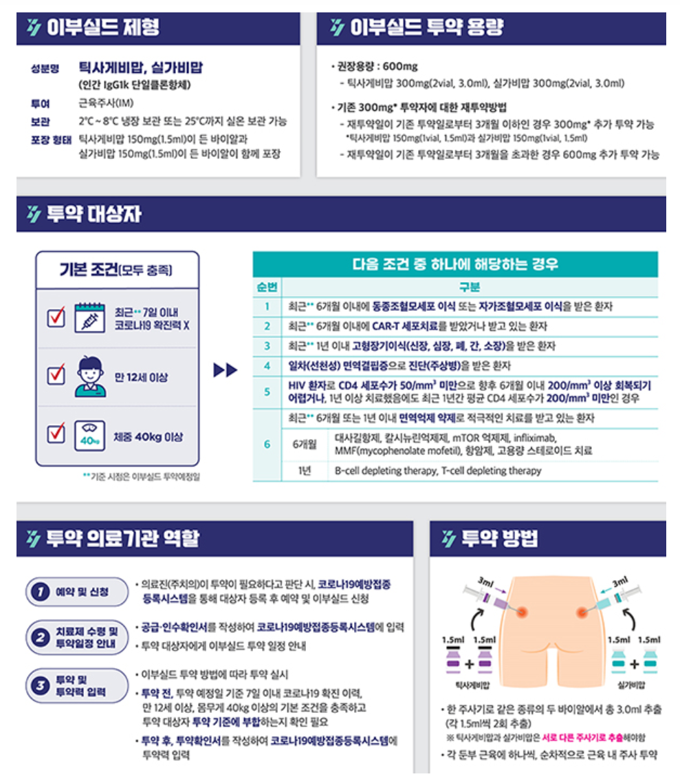 한편 투약 대상 확대 및 용량 증량 등 변경된 사항이 적용된 사전예약은 지난 9일부터 실시 중에 있고, 증량된 용량 투약은 14일부터 시행한다. 추진단은 “겨울철 유행을 대비해 이부실드 투약 대상 확대 및 용량이 증량된 만큼 심각한 면역저하치료를 받고 있는 중증면역저하자는 이부실드를 투약받아 추가적인 보호를 받기를 바란다”고 밝혔다. 그러면서 “투약의료기관의 의료진은 변경된 지침을 숙지해 이부실드 투약 대상에 해당하는 환자가 있을 때 신속하게 투약이 이뤄질 수 있도록 대상자에게 적극적으로 설명하고 투약신청을 해달라”고 당부했다.