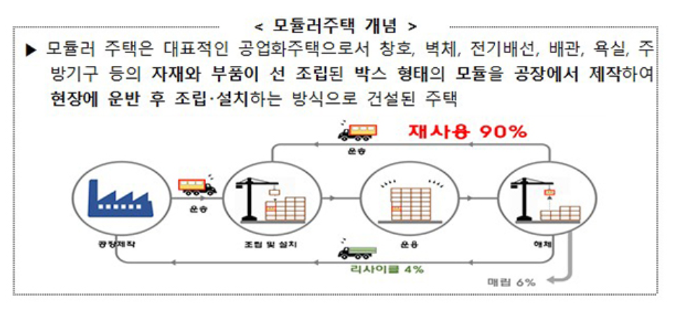대표적인 스마트건설 기술이자 주택건설 산업의 혁신 아이콘인 모듈러주택에 대한 관심이 4차 산업혁명 시대와 맞물려 크게 높아지고 있다. 특히 모듈러주택의 혁신적인 주택생산 방식은 공기 단축, 건축물 폐기물 감소, 에너지 사용 및 탄소배출 감소, 소음·진동·분진 등 환경문제 해결과 품질 향상 등 많은 장점이 있다. 건설 기능인력 고령화 및 숙련공 부족 등 주택건설 산업이 당면한 문제에 대응하기 위한 효과적인 수단으로도 자리 잡을 전망이다. 하지만 국내 주택건설 산업은 여전히 철근콘크리트 공법을 바탕으로 한 노동 집약적·현장 중심의 전통적인 건설방식이 대다수를 차지하고 있다. 또한 현재 모듈러주택은 대부분 연구개발에 따른 실증사업과 공공발주를 중심으로 건설되고 있어 모듈러주택이 전체 주택건설 산업에서 차지하는 비중은 미미한 실정이다.
