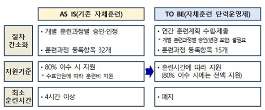 ‘자체훈련 탄력운영제’를 도입해 우수훈련 기업이 직업훈련을 직접 실시하는 자체훈련의 경우 기업은 연간 훈련계획만 제출하면 별도의 승인 절차 없이도 정부로부터 훈련비를 지원받을 수 있다. 또 내년부터는 훈련과정당 4시간 최소 훈련시간 규제도 과감히 폐지해 기업이 필요한 훈련이라면 1~3시간 훈련도 정부지원을 받을 수 있도록 한다.