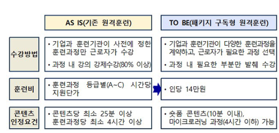 앞으로 근로자는 본인이 필요한 훈련과정을 스스로 선택해 수강할 수 있게 된다. 그동안 원격훈련제도는 사업주와 위탁훈련기관이 훈련과정별로 단건 계약하고 근로자가 훈련과정을 전부 수강해야만 훈련비가 지원됐지만, 사업주와 위탁훈련기관 간 다양한 훈련과정을 패키지로 계약하는 것을 허용한다. 패키지 계약된 훈련과정 중 근로자가 선택한 훈련콘텐츠만 수강해도 훈련비가 지원되기 때문에 근로자는 원하는 내용만 골라서 들을 수 있다. 또 훈련시간을 확보하기 어려운 재직근로자 특성상 선호하는 10분 이내의 ‘짤강(short-form contents)’ 등도 이용할 수 있게 됐다.