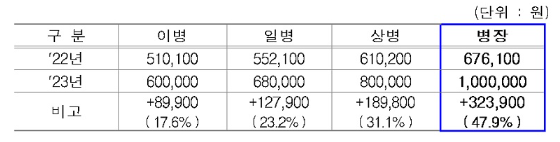 국방부는 2025년까지 병장 기준 병 봉급을 150만원까지 인상할 예정이다. 병 봉급과 자산형성프로그램을 결합해 2025년까지 205만원을 제공하는 것이 목표다. 장병내일준비적금에 대한 재정지원금도 인상된다. 합리적 저축습관 형성과 전역 후 목돈 마련을 위해 장병내일준비적금에 대한 정부 지원비율을 33%에서 71%로 38%포인트 인상한다. 2023년 정부지원금은 월 최대 14만원에서 30만원으로 인상된다. 인상된 재정지원금은 1월 납입분부터 적용되며, 이전 납입액은 기존 지원금액이 적용된다. 병영생활관도 개선된다. 미래세대 장병들의 요구와 선호를 충족할 수 있도록 병영생활관의 생활실을 위생시설이 포함된 2~4인실로 개선한다. 생활실 거주인원을 현행 9인 기준에서 2인 내지 4인으로 줄이고, 화장실과 샤워실을 생활실 내에 배치한다. 이렇게 되면 장병들에게 독립된 생활공간이 보장돼 병영생활 환경이 크게 개선될 것으로 전망된다.
