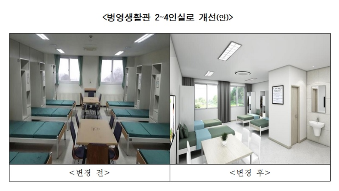 국방부는 2023년 이후 착수하는 모든 병영생활관 개선사업에 2~4인실을 원칙적으로 적용하고 첫해인 2023년 54개 동을 시작으로 연차별로 개선해 나갈 예정이다.