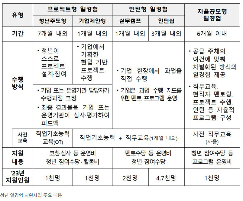 청년 일경험 지원사업은 기업탐방형, 프로젝트형, 인턴형, 자율공모형으로 이루어져 있다. 이중 그동안 추진해왔던 기업탐방형 프로그램은 기존과 같이 고용센터를 통해 먼저 운영기관을 선정했고, 올해 신설된 프로젝트형 등은 일경험 통합지원센터에서 이번 공고로 운영기관을 모집한다. 먼저 프로젝트형 일경험 프로그램은 청년들이 팀을 구성해 직무 기반 실전형 프로젝트를 수행하고 결과물을 제출하는 방식의 프로그램으로 청년이 프로젝트를 수행할 때, 기업 담당자, 운영기관이 선임한 멘토 등의 코치·피드백 등 지원을 받을 수 있다. 인턴형 일경험 프로그램은 기업에서 직접 과업을 수행하면서 실전형 직무역량을 키울 수 있는 프로그램이다. 이는 재학생 맞춤 모델인 실무캠프와 상대적으로 중장기 과정인 인턴십이 있는데, 기업제안형 프로젝트 유형과 마찬가지로 청년은 사전 직무교육을 받고 인턴에 참여하게 된다.