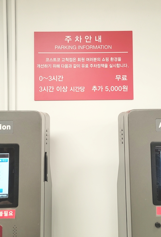 지하주차장 입구에 주차 정산기가 있는데요. 고척 코스트코는 0~3시간까지 무료주차가 가능합니다. 즉, 3시간 이내 출차시에는 정산이 불필요 한거죠! 그 이후는 구매영수증 가격과 관련없이 (3시간 이상) 시간당 5천원의 추가 주차요금이 발생합니다. 이 점 참고하셔서 혼선없이 이용하시길 바래요~
