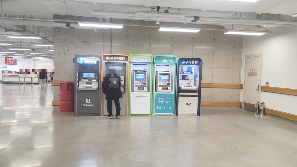 입구로 들어가기전 이용가능한 ATM기 입니다. 신한은행, 국민은행, NH농협은행, 하나은행, 우리은행 총 5개 기기가 마련되어 있습니다. (참고로 매장입구 뿐만아니라 지하3층에도 ATM기가 마련되어 있어요!)