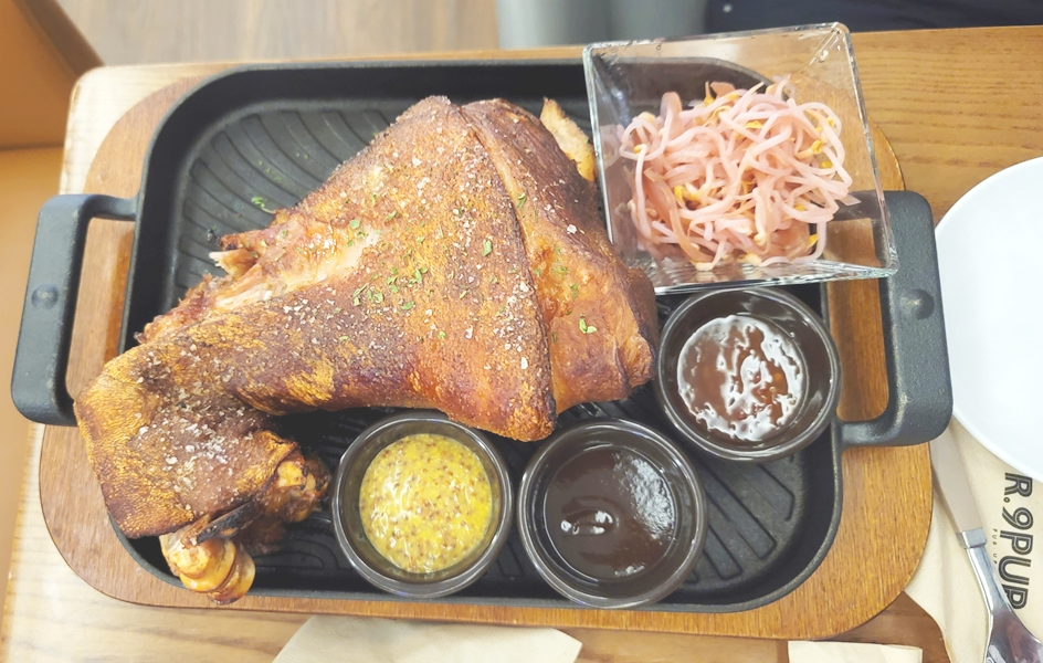 슈바인학센도 시켜봅니다. 돼지 다리를 구워서 만드는 독일 바이에른 지방의 요리인데요. 독일어를 글자 그대로 풀이하면 돼지(Schwein)+무릎(Haxe) 이라는 뜻 이라고 하네요. 고기해체(?)는 직접 하셔야 합니다. 먹기좋게 잘라나오지 않아요. 힘들게 잘라 먹었답니다 ㅋㅋ