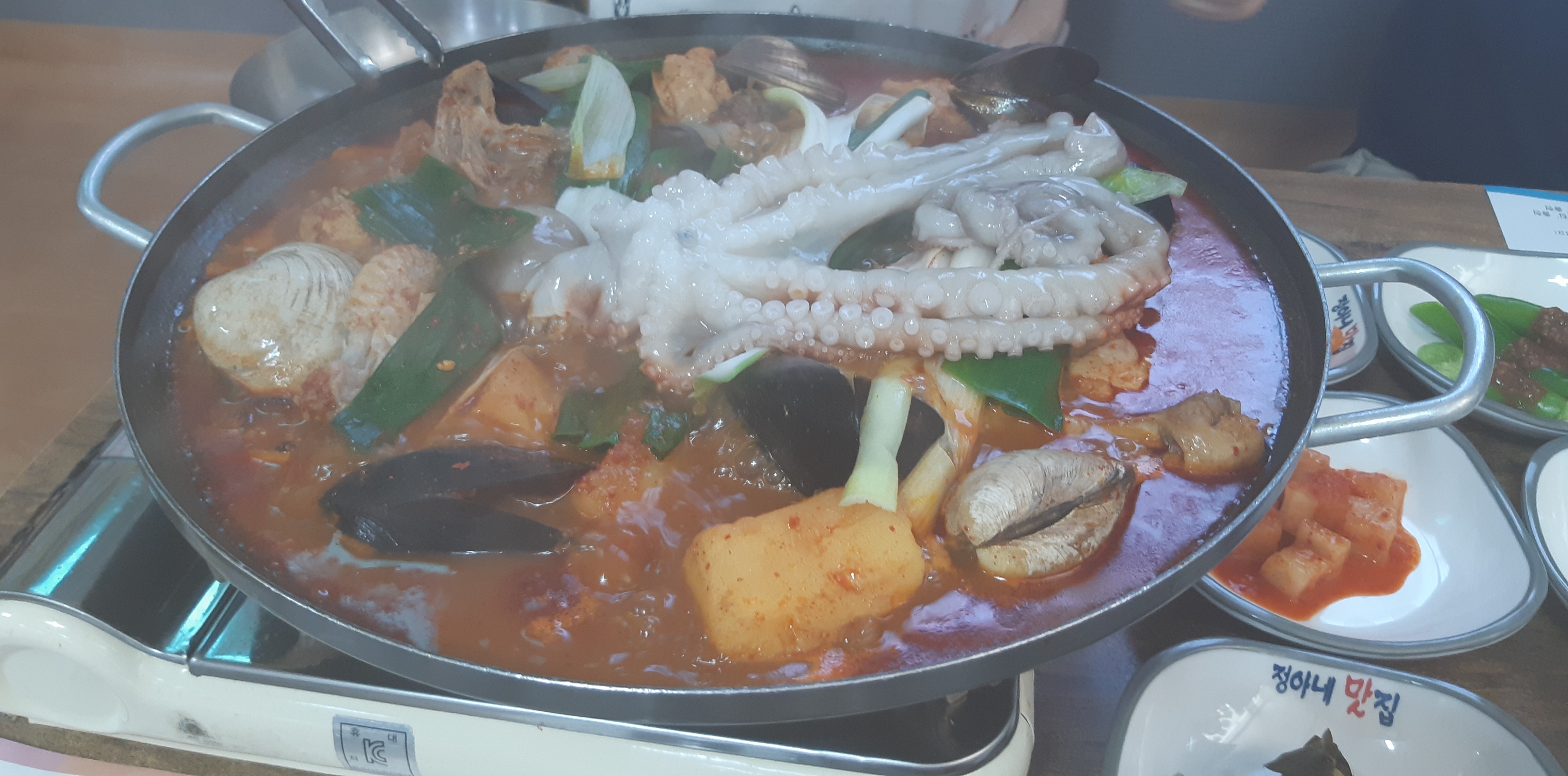중앙시장 에서 차로 약 10분정도 거리에 위치해 있는 닭볶음탕 집이에요. 닭볶음탕에 해물이 들어가있어서 많이들 찾으시는 것 같아요. 제가 방문했을 당시는 너무 더워서 땀이 주륵주륵 났던 날인데 에어컨도 시원하지 않아서 에어컨을 내리다가 주인아주머니께 호되게 혼난 기억이 있어요 ㅠㅠ 에어컨 내리면 에어컨 바람에 가스불 날린다고 소리를 지르셔서 (이래서 무풍에어컨이 미래의 대세인가ㅠㅠ) 날씨는 덥고 불 앞이라 실내도 덥고, 팔팔 끓는 음식이라 속도 뜨거운데 주인아주머니 아저씨의 날카로운 가르침에 솔직히 맛은 잘 기억이 안나요^^;; 하지만 해물과 닭의 조합이라니! 이것도 절대로 맛이 없을수는 없는 조화가 아니겠습니까 ㅎㅎㅎ