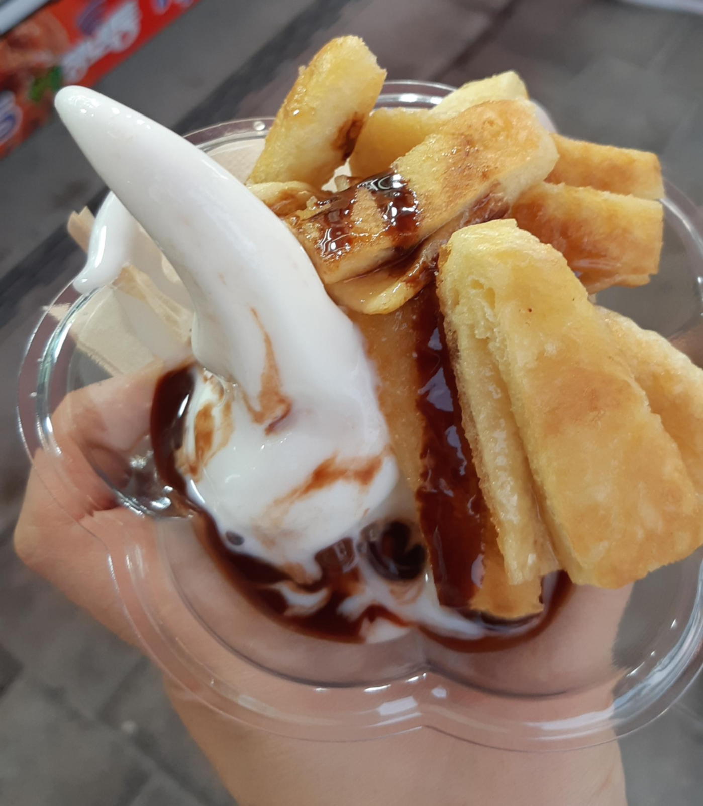 닭강정 포장을 기다리는 동안 또 먹을거없나 살거없나 주변을 서성이다 발견한 새로운 간식인데요, 그동안 본적없는 아이스크림 호떡 이에요 (응 좀 돌아다녀~ 라고 하실수있는데 ㅋ) 생각해보면 단순히 아이스크림에 호떡 얹은건데 저는 생각도 못해본 조합이고 처음 맛보는 간식이라 정말 맛있었어요. 아이스크림 와플도 맛있는데 생각지도 못한 호떡이 들어가도 뜨거움과 차가움의 조화가 굉장히 새롭고 특색있는 맛 이었습니다. 요리는 창조하는 자의 것(?) 인가봅니다.