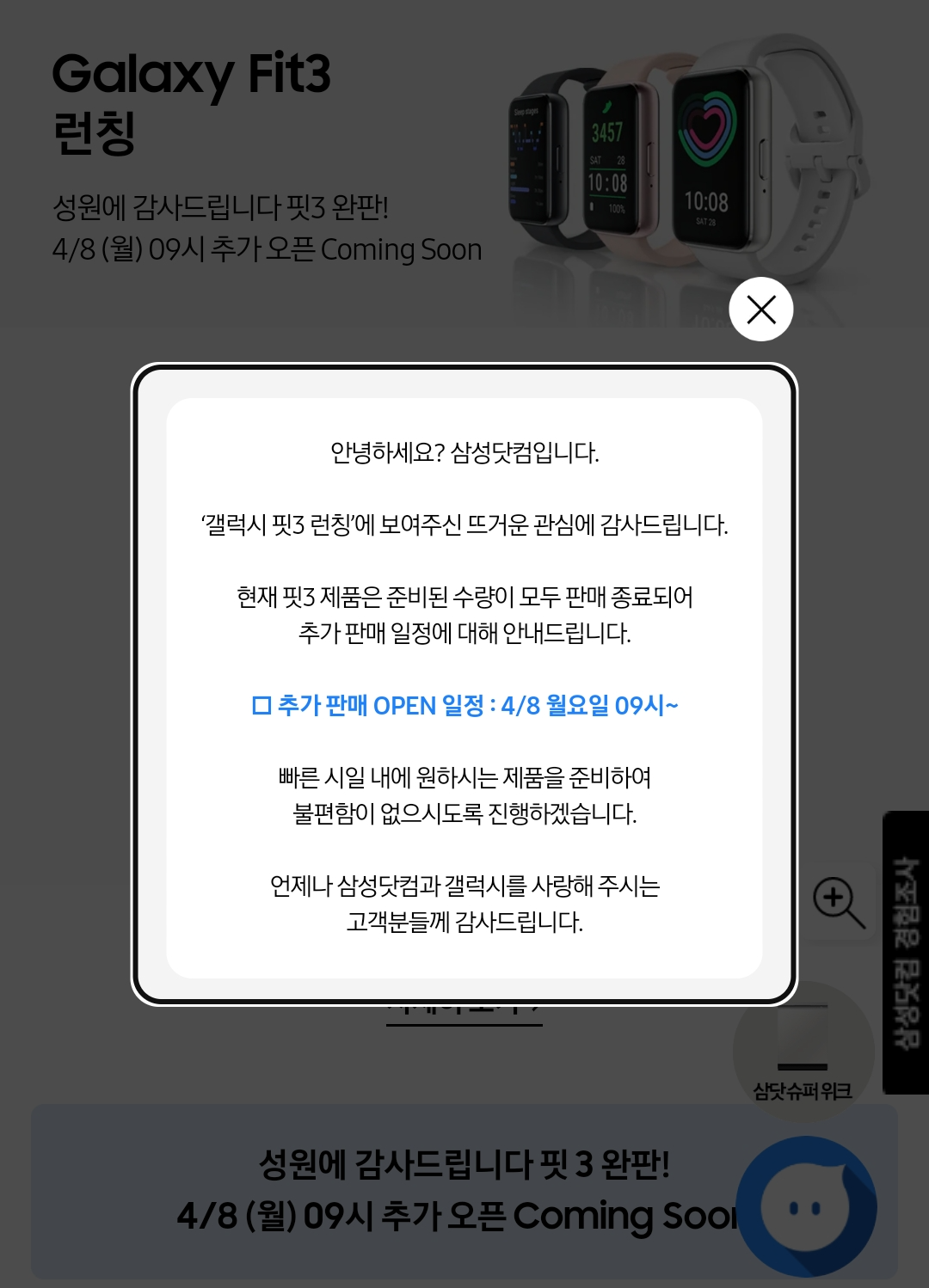 현재 삼성닷컴 홈페이지엔 준비된 수량이 완판되어 차주 월요일 9시부터 재판매가 이뤄진다고 하는데요, 치열한 결제전(?)이 예상됩니다. 이번 갤럭시핏3 너무나 귀합니다. 고민하고 계신분 있으면 무조건 구입하시라고 강력추천 드리겠어요!