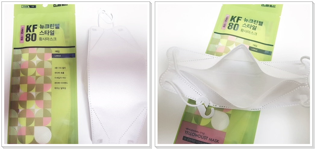 제가 이번에 구입하게 된 뉴크린웰 마스크는 식약처 허가가 완료된 의약외품 제품으로 모양은 일반적으로 위아래를 접었다 펴는 3D구조에요. 색상이 화이트, 블랙, 아이보리, 네이비, 그레이, 그린, 연황색, 와인 이렇게 총 8가지가 있다는데 (왜이렇게 많은거지;;) 제가 구입한 색상은 화이트 에요. 화이트컬러는 햇빛에 노출되면 반사되어 마스크로 덮이지 않은 윗부분의 피부가 자외선에 노출될 수 있다고 하던데... 늘어날 기미가 걱정되지만 색상선택권이 없는 요즘이니 보이는데로 구매해봤어요. 국내생산 제품으로 신뢰가 가지만 저는 마스크재질 특유의 냄새가 참기 힘들었어요. 후기를 보니 어떤분은 괜찮다고 하고 어떤분은 냄새가 심하다고 하는데 뽑기 운 인건지는 모르겠습니다. 하지만 사용전날 열어서 펼쳐두었다가 다음날 착용하니 괜찮을만큼 사용할만 하더라구요. 50개 한박스인데... 전부 이렇게 써야하겠지요,, ㅠ_ㅠ