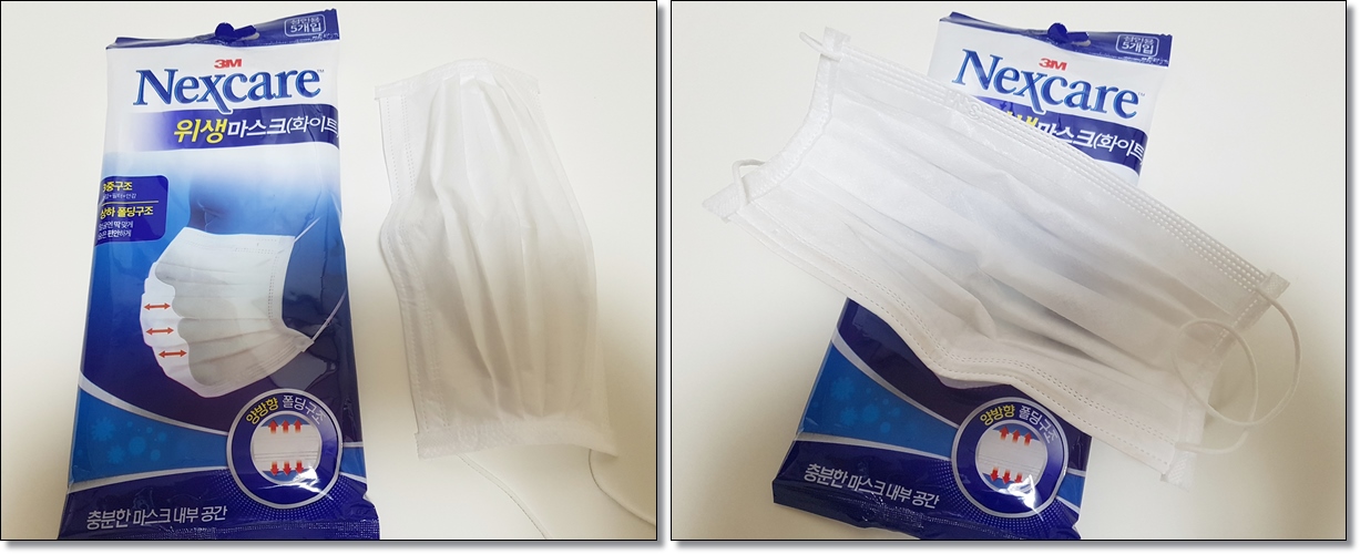 제가 구입한 제품은 5개가 한꺼번에 들어있는 제품입니다. 일회용 마스크 50매 들이 제품을 사서 헤프게 마구써버리던 지난시절을 반성합니다..ㅠ_ㅠ 심지어 1개당 1개별 포장이었던 그 흔한 유한킴벌리 덴탈마스크도 이젠 만나보기 힘드네요. 하아..눈물좀 닦고... 본론으로 가서 3M 넥스케어 위생마스크는 내수가공으로 수분통과가 어려운 겉감과 고밀도 정전필터가 내장된 중간필터, 그리고 촉감이 좋고 통기성이 우수한 안감으로 3중구조화가 된 마스크 인데요. 끈도 너무나 당기지 않고 넉넉한 길이어서 귀가 아푸지 않더라구요. 너무 느슨하다 싶을땐 X자로 한번 꼬아서 귀에 착용 하면 딱 안정감 있는 밀착으로 사용가능 합니다. 크나큰 얼굴인 저에게도 착 맞는 아주 만족스런 제품이에요~