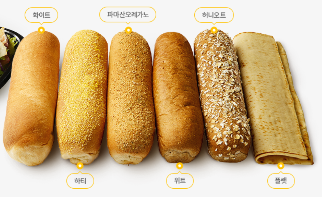 우선 빵 종류에요. 빵은 6개의 종류가 있는데요. 저는 샌드위치 종류로는 딱딱한 빵의 조합을 싫어해서 질기고 딱딱한 바게트종류는 피하는 편이에요. 그래도 쫄깃하고 고소한 식감을 놓칠수는 없죠?