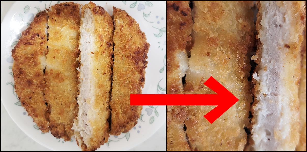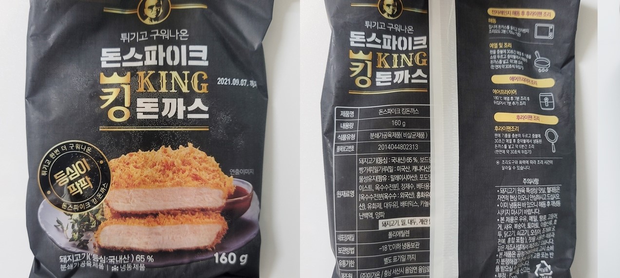 바로 시켜 본 킹 돈까스, 과연 이름만큼이나 킹 사이즈 일지 궁금했습니다. 먼저 160g의 무게에 돼지고기는 국내산 등심으로 65%의 함량표기가 되어있음이 확인됩니다. 근데 함량은 다른 돈까스 들도 비슷비슷 하더라구요~ 다른 제품과 비교해 큰 차이는 없는 것 같아요. 저는 겉포장에 표기된 조리가이드 대로 에어프라이기에 180도로 7분 돌린 후 뒤집어서 7분을 다시 조리했어요.