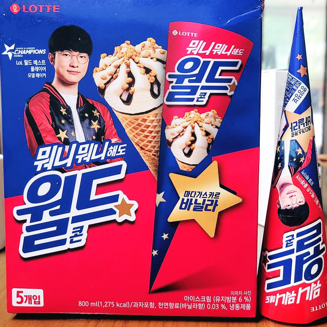 이마트몰 쓱배송으로 도착한 월드콘 박스. 너무 작아서 미니 아이스크림인가 의심했는데 열어보니 제대로 된 정품 월드콘이 알차게 5개 들어있었다. 세상 뿌듯한 것. 집에 가만히 앉아서 아이스크림을 배달 받을 수 있다니. 새삼 신기한 세상임을 다시한번 느낀다. 월드콘 박스에 보이는 사진은 누구신지, 새로운 모델인가 보다 했는데 찾아보니 '페이커'라는 아주 유명한 플레이어 (프로게이머)로 확인된다. 죄송하지만 누구신지 이제 알았다. 수상경력이 매우 화려하신 분이다. 오 e스포츠 국가대표 시라니... 몰라뵈서 죄송합니다. 흑;