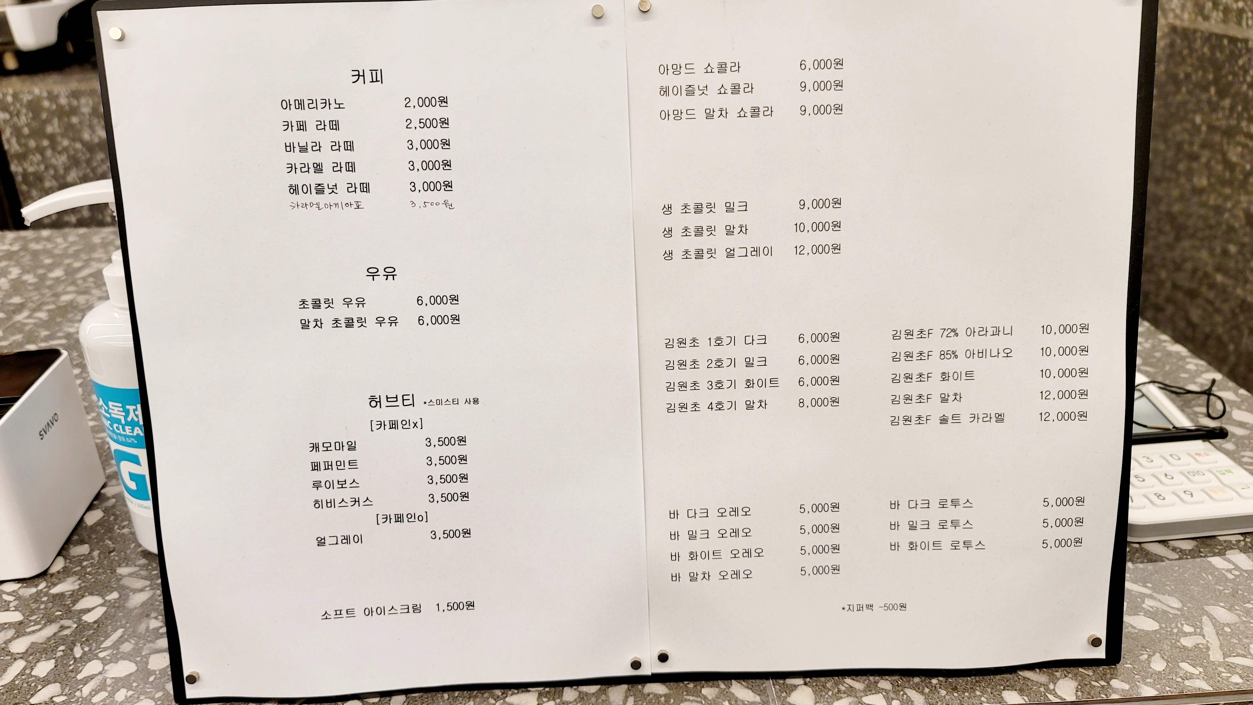 메뉴판 입니다. 전 녹차의 초록초록한 향과 그 씁쓸한맛을 좋아하기때문에 묻지도 따지지도 않고 말차 생초콜릿을 먼저 구입 해 보았습니다. 가격은 한장. 가공하지 않은 생초콜릿 이기 때문에 단가가 좀 높아보였어요~