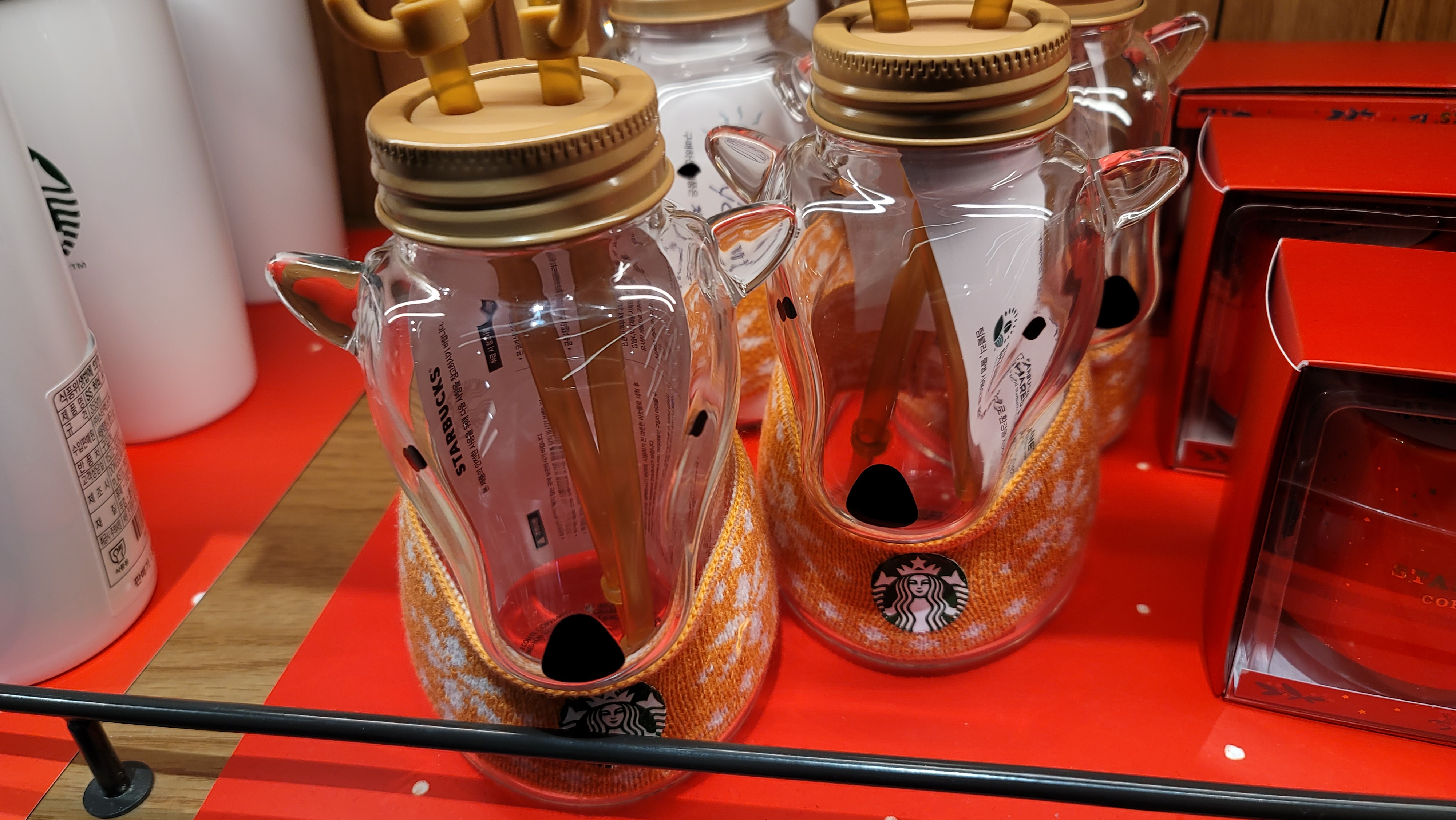 이건 당연히 루돌프라고 생각했는데 자세히 보니 뭔가 고라니같이 생겼어요. 그래도 크리스마스 MD니까 루돌프라고 생각해야 겠죠!? 뭔가 따뜻한 목도리를 두른듯한 루돌프글라스 컵 이네요. 음료를 넣으면 음료색상에 따라 얼굴색이 달라질 것 같아서 사용할때마다 귀여움이 느껴질 것 같습니다.