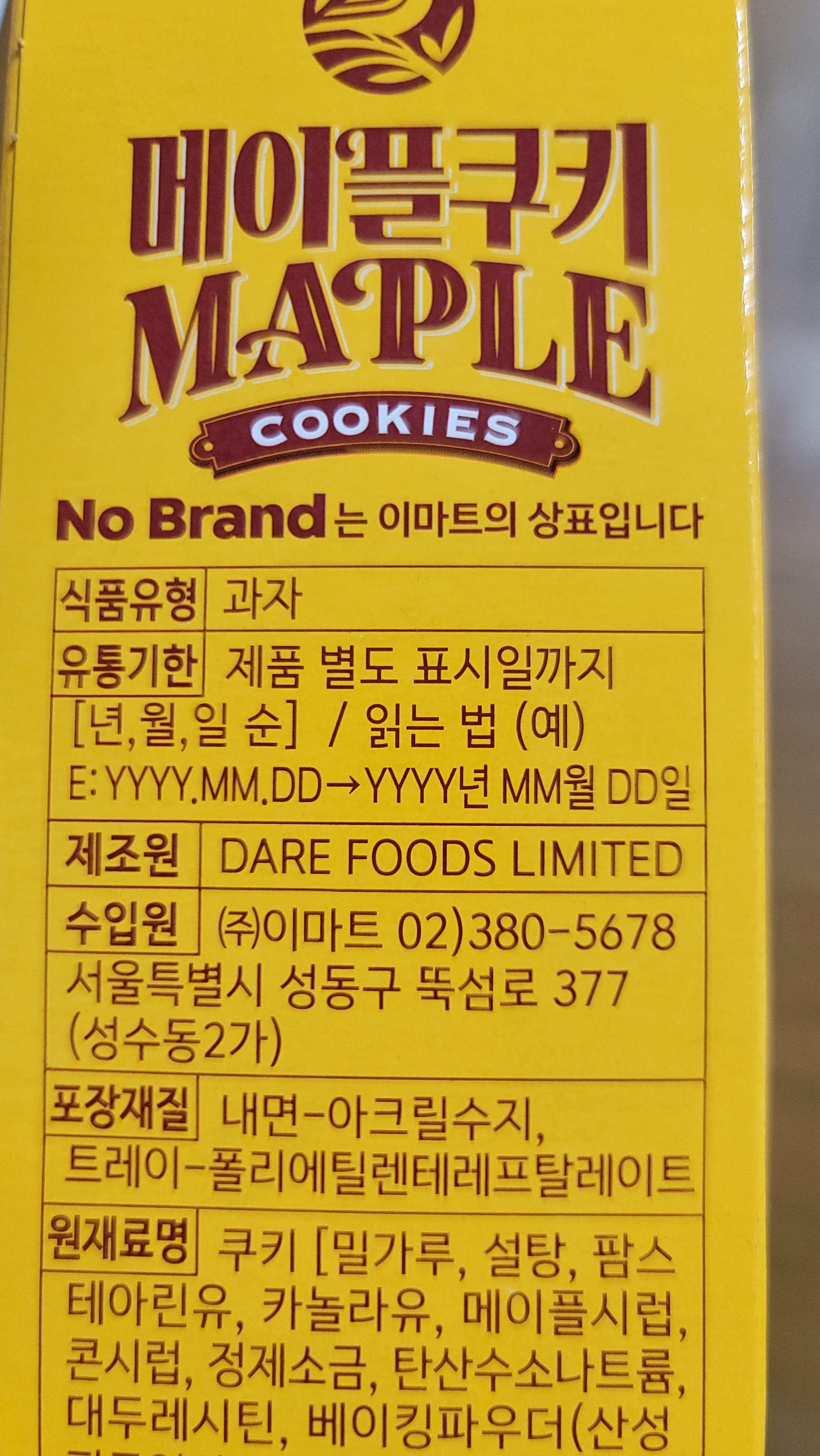 제조원이 DARE FOODS LIMITED라고 되어있죠? 한국에없으면 직구라도 하자 싶어서 찾아본 오리지널쿠키 제조원과 동일하네요. 설마 이름만 같은걸까요? 아니겠죠? OEM상품이라고 겉박스에 표기되어 있는걸로봐서 아마 이마트가 오리지널제조사에 OEM을 주고 생산하는것이 아닐까 생각됩니다. 이마트에 직접 물어보진않았어요 ㅎㅎㅎ 메이플쿠키를 그리워하며 찾아헤메이고 계신 여러분들께 강력추천 합니다!! 오늘도 달콤달콤한 하루 보내시기 바랍니다 :)
